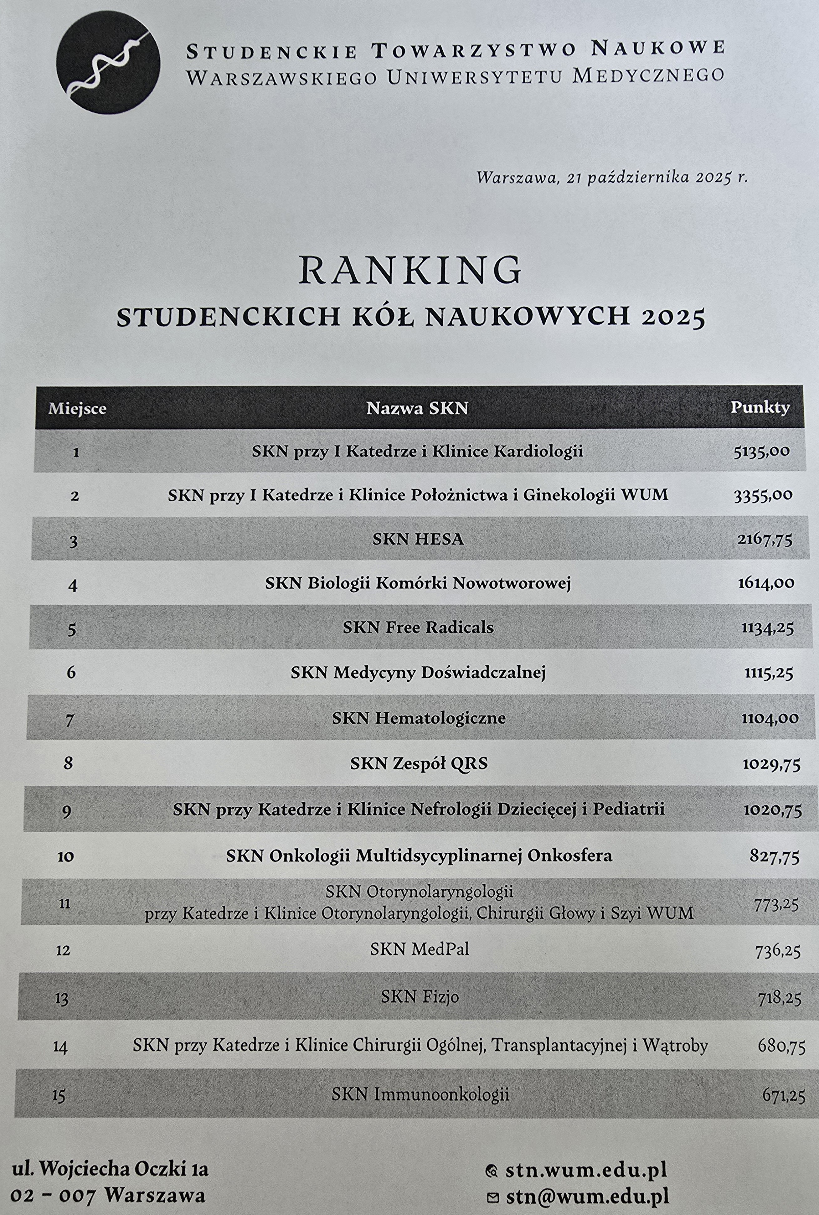 Ranking Studenckich Kół Naukowych WUM 2025
